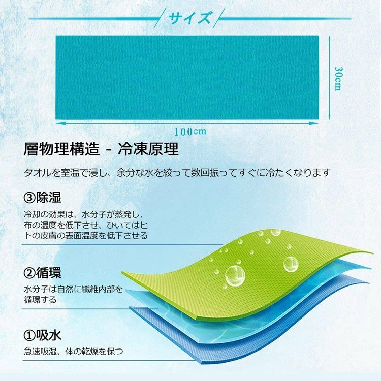 冷感運動毛巾是進口高科技功能性面料——coolcore冷感技術;採用3D立體編織工藝50%冷感絲編織,無論熱水還是冷水,浸濕後甩一甩2秒速冷(就是這麼神奇,瞬間接觸人體冷感且涼而不冰)可持續冷感大約5-7小時。
